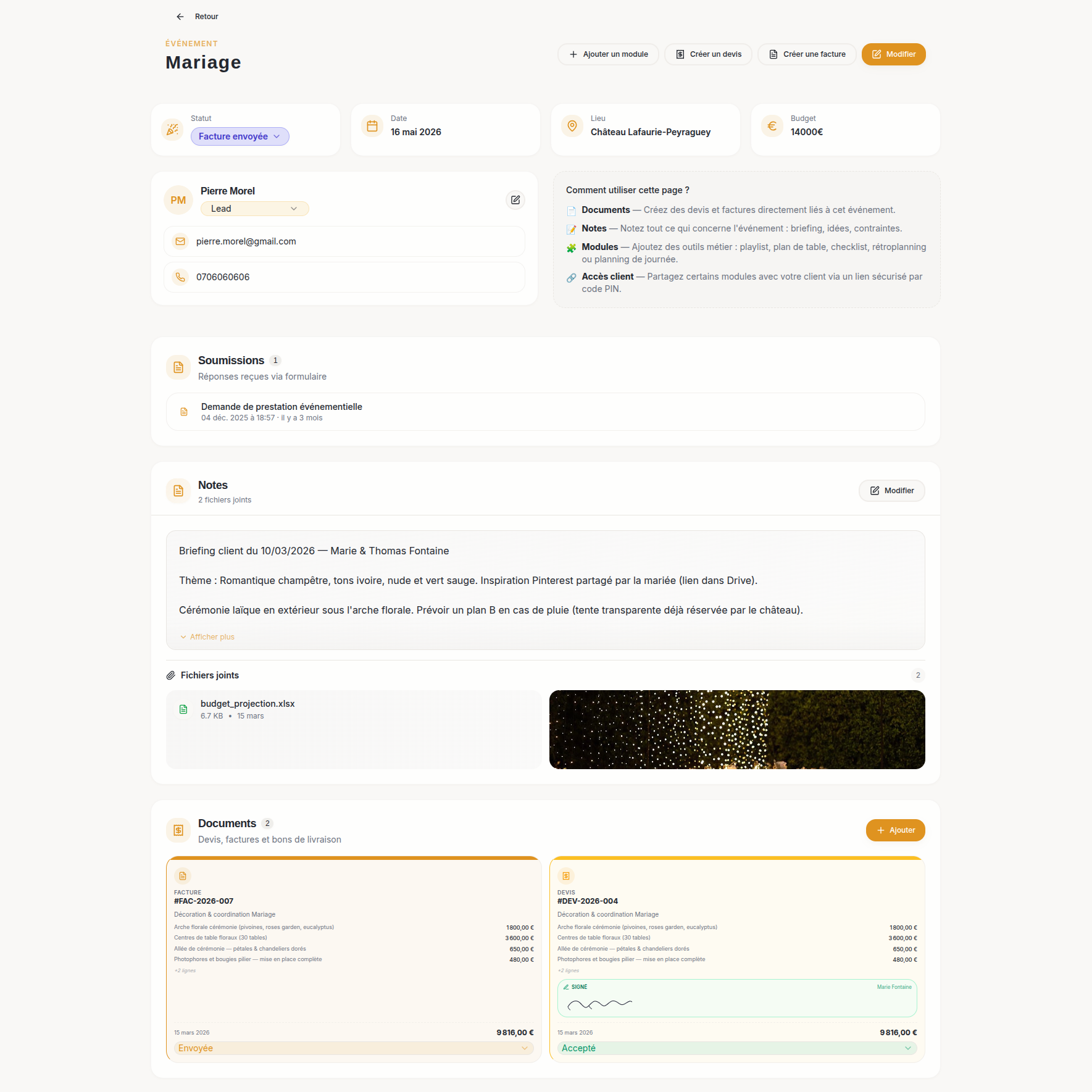 Devis, factures, emails, signature électronique — tout votre business au même endroit, lié à l'événement. Fini les onglets et les copier-coller entre outils.