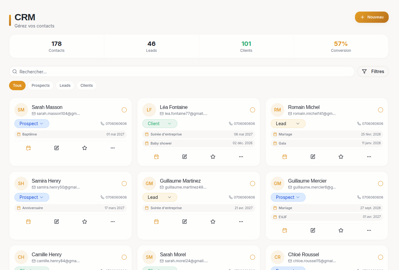 Prospects, événements, devis, emails — tout au même endroit. Zéro friction, zéro double saisie.