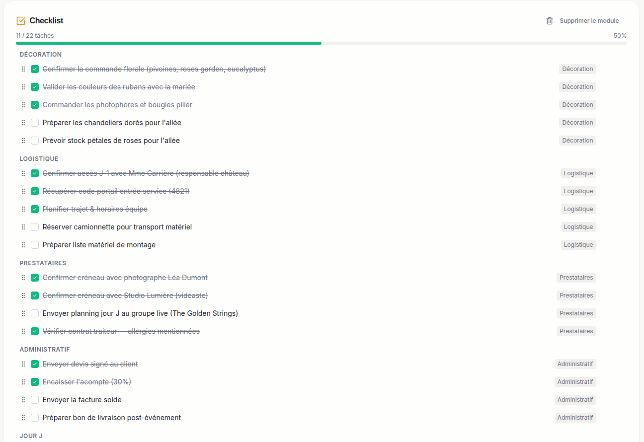Créez des listes de tâches liées à l'événement, organisées par catégories (décoration, logistique, prestataires…). Cochez au fil de la préparation et partagez avec votre équipe ou votre client.