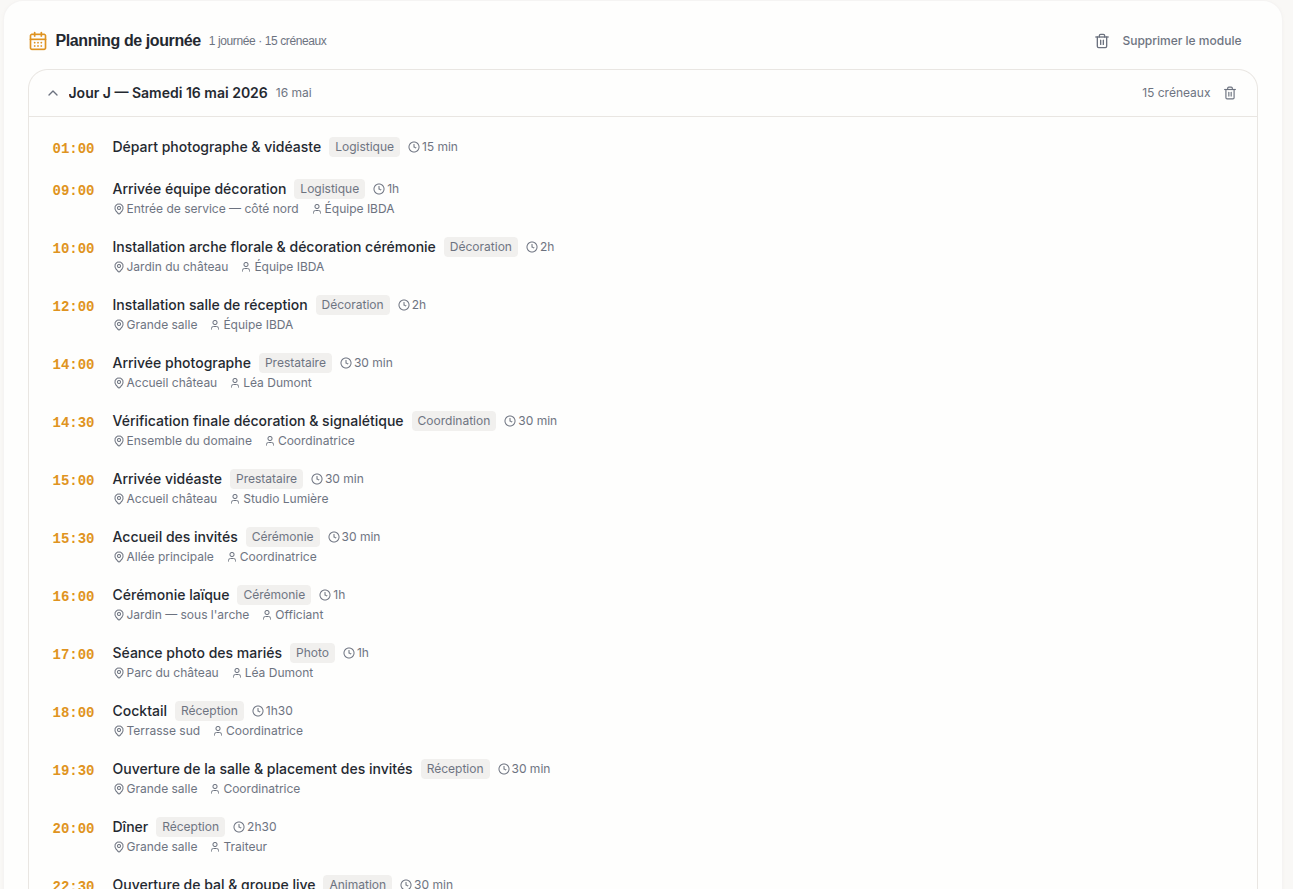 Construisez le planning détaillé du jour de l'événement : horaires, lieux, responsables, durées, notes. Partagez-le avec toute l'équipe et les prestataires pour une coordination sans accroc.