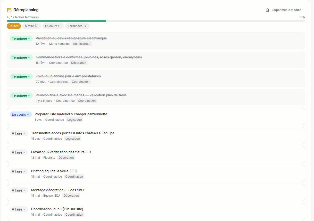 Planifiez toutes les étapes de préparation dans un rétroplanning structuré. Assignez des responsables, des dates butoir et des statuts. Visualisez l'avancement du projet en un coup d'œil.
